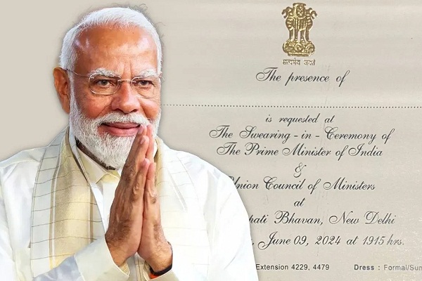 नई दिल्ली- रविवार की शाम 7 बजकर 15 मिनट पर नरेंद्र मोदी का शपथ ग्रहण होगा। शपथ ग्रहण समारोह में करीब 7000 लोगों को न्योता भेजा गया है। वहीं पीएम के शपथ ग्रहण के आमंत्रण की तस्वीर सामने आई है। शुक्रवार को उन्हें एनडीए संसदीय दल का नेता चुना गया था। इसके बाद उन्होंने राष्ट्रपति के समक्ष सरकार बनाने का दावा पेश किया था।
