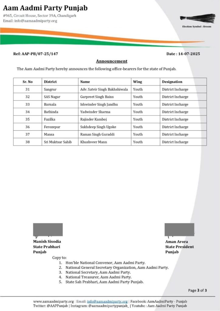 DelhiPoliticsPunjab ਆਮ ਆਦਮੀ ਪਾਰਟੀ ਨੇ ਪੰਜਾਬ ਯੂਥ ਵਿੰਗ ( Youth Wing ) ਤੇ ਮਹਿਲਾ ਵਿੰਗ (Women Wing) ਦੇ ਅਹੁਦੇਦਾਰਾਂ ਦਾ ਕੀਤਾ ਐਲਾਨ… ਦੇਖੋ ਲਿਸਟ Last updated: 2025/07/14 at 8:15 PM Talk Hindustan Share 0 Min Read SHARE TAGGED: Political Share This Article Facebook Twitter Whatsapp Whatsapp Telegram Copy Link Share Previous Article गांव सराय खास में लगाया गया मुफ्त मेडिकल कैंप Next Article कमिश्नरेट पुलिस जालंधर ने चंद घंटों में सुलझाया हत्या का मामला, दो गिरफ्तार Leave a comment Leave a comment Leave a Reply Cancel replyYour email address will not be published. Required fields are marked *Comment * Name * Email * Website Save my name, email, and website in this browser for the next time I comment.