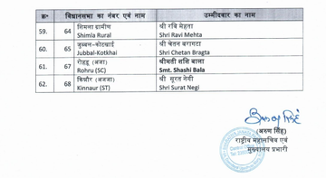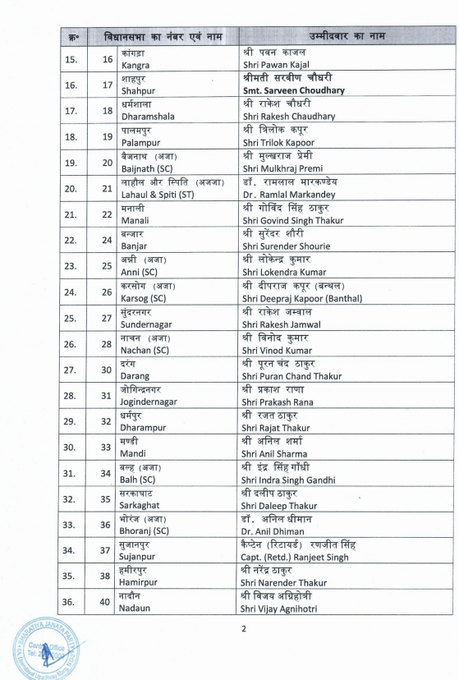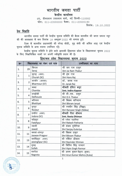 हिमाचल प्रदेश विधान सभा चुनाव…..बीजेपी ने विधानसभा चुनावो में उम्मीदवारो की पहली सूची की जारी