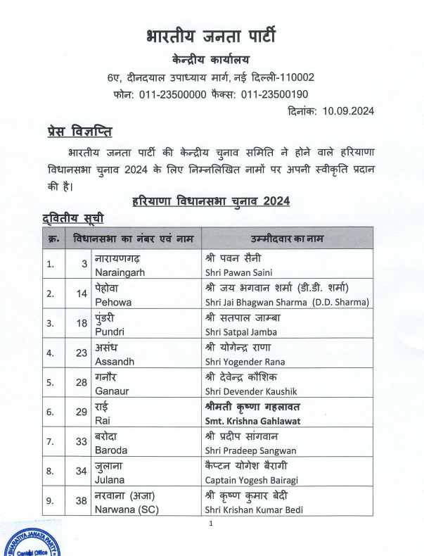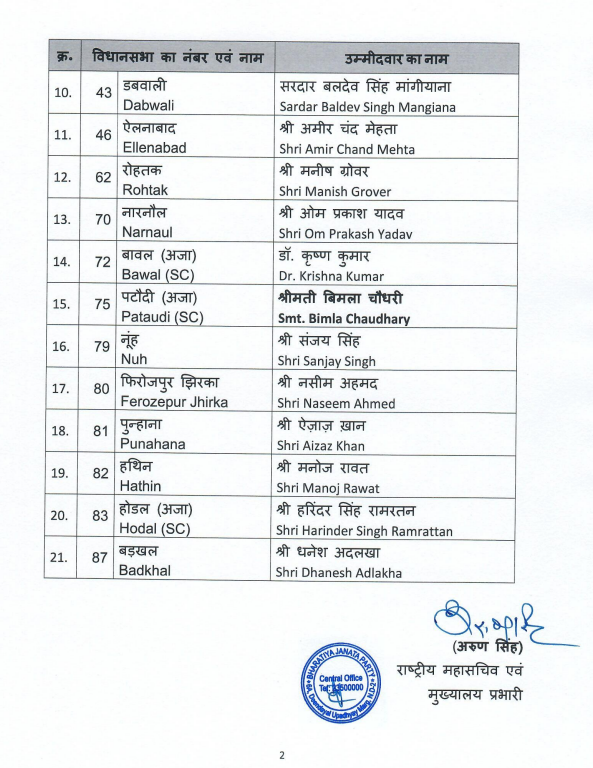 नई दिल्ली : भारतीय जनता पार्टी (बीजेपी) ने हरियाणा विधानसभा चुनाव के लिए अपनी दूसरी सूची जारी कर दी है, जिसमें कुल 21 उम्मीदवारों के नाम शामिल हैं। इससे पहले, पार्टी ने अपनी पहली सूची में 67 उम्मीदवारों के नाम का ऐलान किया था।
