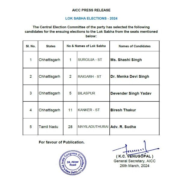 कांग्रेस ने लोकसभा चुनाव के लिए उम्मीदवारों की सातवीं सूची जारी कर दी है। इसमें छत्तीसगढ़ की चार और तमिलनाडु की एक लोकसभा सीट के लिए उममीदवारों का एलान कर दिया गया है।