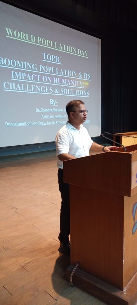 इस अवसर पर लवली प्रोफेशनल यूनिवर्सिटी के सामाजिक विज्ञान विभाग के प्रमुख डॉ चंद्र शेखर सिंह मुख्य वक्ता के रूप में उपस्थित थे। उन्होंने “बढ़ती जनसंख्या और मानवता पर इसका प्रभाव: चुनौतियाँ और प्रदूषण” विषय पर व्याख्यान दिया। अपने संबोधन के दौरान डॉ. शेखर ने जनसंख्या वृद्धि के मानवता पर पड़ने वाले विभिन्न प्रभावों पर प्रकाश डाला।