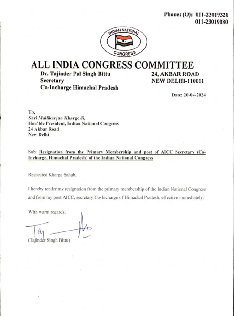Reading: कांग्रेस को बड़ा झटका, हिमाचल कांग्रेस के सह प्रभारी स. तेजिन्द्र सिंह बिट्टू आज भाजपा में होंगे शामिल