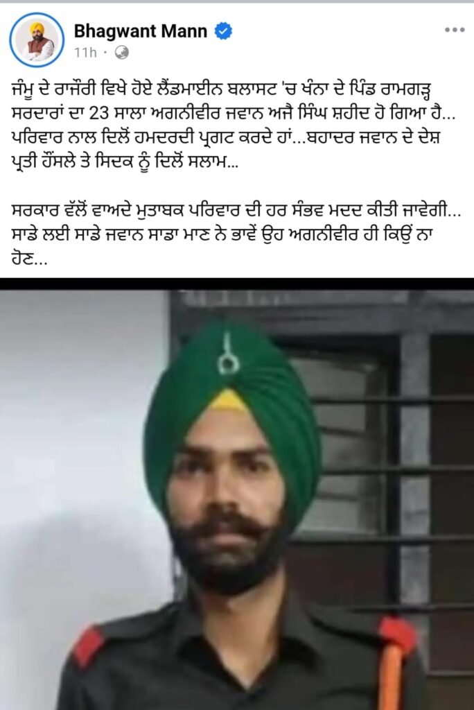 ਚੰਡੀਗੜ੍ਹ, 19 ਜਨਵਰੀ : ਪੰਜਾਬ ਦੇ ਮੁੱਖ ਮੰਤਰੀ ਭਗਵੰਤ ਸਿੰਘ ਮਾਨ ਨੇ 23 ਸਾਲਾ ਫੌਜੀ ਜਵਾਨ ਅਜੈ ਸਿੰਘ ਦੀ ਡਿਊਟੀ ਨਿਭਾਉਂਦੇ ਸਮੇਂ ਹੋਈ ਸ਼ਹਾਦਤ ‘ਤੇ ਡੂੰਘੇ ਦੁੱਖ ਦਾ ਪ੍ਰਗਟਾਵਾ ਕੀਤਾ ਹੈ। ਇੱਥੇ ਜਾਰੀ ਬਿਆਨ ਵਿੱਚ ਮੁੱਖ ਮੰਤਰੀ ਨੇ ਕਿਹਾ ਕਿ ਅਗਨੀਵੀਰ ਅਜੈ ਸਿੰਘ, ਜੋ ਖੰਨਾ ਨੇੜਲੇ ਪਿੰਡ ਰਾਮਗੜ੍ਹ ਸਰਦਾਰਾਂ ਦਾ ਰਹਿਣ ਵਾਲਾ ਸੀ, ਇਕ ਬਾਰੂਦੀ ਸੁਰੰਗ ਧਮਾਕੇ ਵਿੱਚ ਸ਼ਹੀਦ ਹੋ ਗਿਆ। ਭਗਵੰਤ ਸਿੰਘ ਮਾਨ ਨੇ ਕਿਹਾ ਕਿ ਇਸ ਬਹਾਦਰ ਜਵਾਨ ਨੇ ਜੰਮੂ-ਕਸ਼ਮੀਰ ਵਿਖੇ ਡਿਊਟੀ ਨਿਭਾਉਂਦੇ ਹੋਏ ਆਪਣੀ ਜਾਨ ਕੁਰਬਾਨ ਕਰ ਦਿੱਤੀ। ਉਨ੍ਹਾਂ ਕਿਹਾ ਕਿ ਇਹ ਦੇਸ਼ ਲਈ ਅਤੇ ਖਾਸ ਕਰਕੇ ਪਰਿਵਾਰ ਲਈ ਨਾ ਪੂਰਾ ਹੋਣ ਵਾਲਾ ਘਾਟਾ ਹੈ।