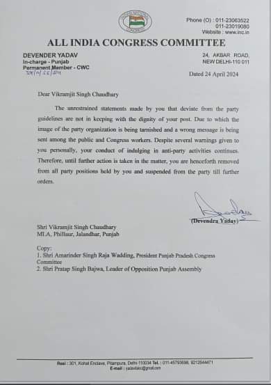 ਕਿਉਂਕਿ ਪਿਛਲੇ ਦਿਨੀ ਵਿਧਾਇਕ ਵਿਕਰਮਜੀਤ ਸਿੰਘ ਚੌਧਰੀ ਦੀ ਮਾਤਾ ਕਰਮਜੀਤ ਕੌਰ ਚੌਧਰੀ ਬੀਜੇਪੀ ਵਿੱਚ ਸ਼ਾਮਿਲ ਹੋ ਗਏ ਸਨ ਜਿਸ ਤੋਂ ਬਾਅਦ ਜਲੰਧਰ ਤੋਂ ਚਰਨਜੀਤ ਸਿੰਘ ਚੰਨੀ ਸਾਬਕਾ ਮੁੱਖ ਮੰਤਰੀ ਪੰਜਾਬ ਨੂੰ ਜਲੰਧਰ ਤੋਂ ਲੋਕ ਸਭਾ ਦਾ ਕਾਂਗਰਸ ਪਾਰਟੀ ਨੇ ਉਮੀਦਵਾਰ ਐਲਾਨ ਕਰ ਦਿੱਤਾ ਸੀ ਜਿਸ ਕਾਰਨ ਟਿਕਟ ਨਾ ਮਿਲਣ ਕਾਰਨ ਚੌਧਰੀ ਅਤੇ ਚਰਨਜੀਤ ਸਿੰਘ ਚੰਨੀ ਦੇ ਵਿਚਾਲੇ ਤਕਰਾਰ ਸ਼ੁਰੂ ਹੋ ਗਈ ਸੀ ਜਿਸ ਤੋਂ ਬਾਅਦ ਪਾਰਟੀ ਨੇ ਐਕਸ਼ਨ ਲੈਂਦੇ ਹੋਏ ਵਿਧਾਇਕ ਬਿਕਰਮ ਚੌਧਰੀ ਨੂੰ ਕਾਂਗਰਸ ਪਾਰਟੀ ਦੇ ਸਾਰੇ ਅਹੁਦਿਆਂ ਤੋਂ ਮੁਅਤਲ ਕਰ ਦਿੱਤਾ