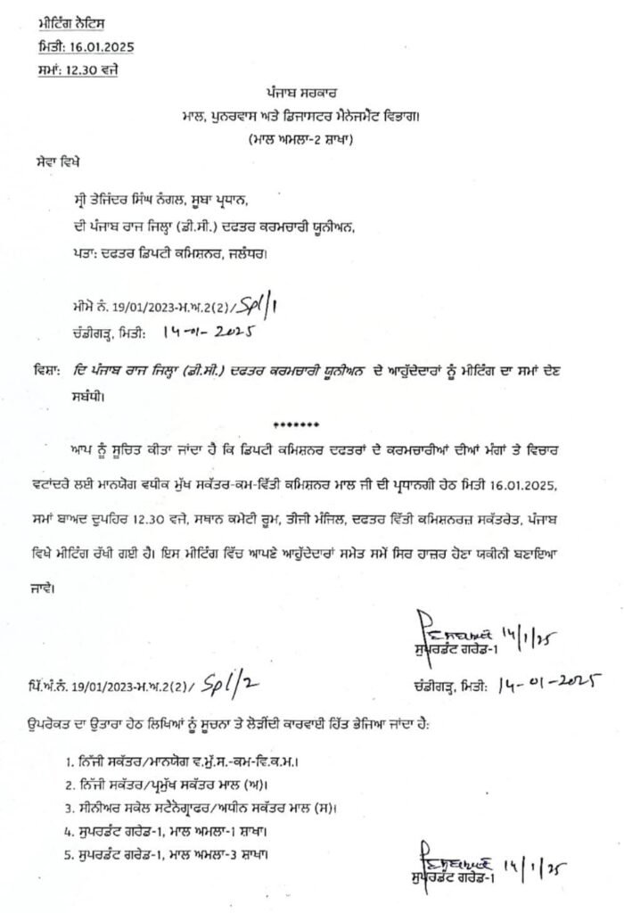 ਜਲੰਧਰ: ਡੀ.ਸੀ. ਦਫਤਰਾਂ ਦੇ ਕਰਮਚਾਰੀਆਂ ਦੀਆਂ ਮੰਗਾਂ ਦੀ ਪੂਰਤੀ ਨਾ ਹੋਣ ਕਰਕੇ ਯੂਨੀਅਨ ਵੱਲੋਂ ਮਿਤੀ 15-01-2025 ਤੋਂ 17-01-2025 ਤੱਕ ਹੜਤਾਲ ਕਰਕੇ ਤਿੰਨ ਦਿਨ ਦਫ਼ਤਰੀ ਕੰਮ ਬੰਦ ਰੱਖਣ ਦਾ ਫ਼ੈਸਲਾ ਲਿਆ ਗਿਆ ਸੀ, ਜਿਸ ਕਰਕੇ ਸਰਕਾਰ ਵਲੋਂ ਪੱਤਰ ਜਾਰੀ ਕਰਕੇ ਯੂਨੀਅਨ ਨੂੰ ਮਿਤੀ 16-01-2025 ਨੂੰ ਮੀਟਿੰਗ ਲਈ ਸੱਦਿਆ ਗਿਆ ਹੈ।
