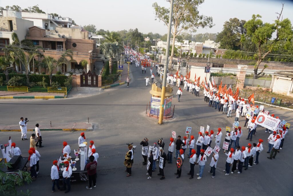 ਕਪੂਰਥਲਾ ( ਗੌਰਵ ਮੜੀਆ ) ਦਿਵਿਆ ਜੋਤੀ ਜਾਗਰਤੀ ਸੰਸਥਾਨ ਸ਼ਾਖਾ ਕਪੂਰਥਲਾ ਵੱਲੋਂ ਸ਼ਹਿਰ ਅੰਦਰ ਸੰਸਥਾਨ ਦੇ ਸਮਾਜਿਕ ਪ੍ਰਕਲਪ ਬੋਧ ਨਸ਼ਾ ਮੁਕਤੀ ਕਾਰਜਕ੍ਰਮ ਦੇ ਅੰਤਰਗਤ ਵਿਸ਼ਾਲ ਪੈਦਲ ਮਾਰਚ ਦਾ ਆਯੋਜਨ ਕੀਤਾ ਗਿਆ। ਇਸ ਪੈਦਲ ਮਾਰਚ ਦੇ ਆਯੋਜਨ ਦੇ ਪਿੱਛੇ ਉਦੇਸ਼ ਸਮਾਜ ਨੂੰ ਨਸ਼ੇ ਦੇ ਪ੍ਰਤੀ ਜਾਗਰੂਕ ਕਰਨਾ ਰਿਹਾ। ਮੁੱਖ ਮਹਿਮਾਨ ਦੇ ਰੂਪ ਵਿੱਚ ਇਸ ਪੈਦਲ ਮਾਰਚ ਨੂੰ ਝੰਡੀ ਦੇ ਕੇ ਰਵਾਨਾ ਕਰਨ ਦੇ ਲਈ ਰੌਸ਼ਨ ਪ੍ਰਿੰਸ (ਪ੍ਰਸਿੱਧ ਗਾਇਕ ਤੇ ਅਭਿਨੇਤਾ) ਪਹੁੰਚੇ ਪੈਦਲ ਯਾਤਰਾ ਵਿੱਚ ਹਜ਼ਾਰਾਂ ਦੀ ਸੰਖਿਆ ਵਿੱਚ ਨੌਜਵਾਨਾਂ ਨੇ ਭਾਗ ਲਿਆ ਜਿਸ ਵਿੱਚ ਨਸ਼ਾ ਵਿਰੋਧੀ ਝਾਕੀਆਂ, ਦੇਸ਼ ਭਗਤੀ ਦੀਆਂ ਝਾਕੀਆਂ, ਨੁੱਕੜ ਨਾਟਕ ਤੇ ਹੋਰ ਪ੍ਰੇਰਨਾਵਾਂ ਦੁਆਰਾ ਸਮਾਜ ਨੂੰ ਨਸ਼ੇ ਦੇ ਪ੍ਰਤੀ ਜਾਗਰੂਕ ਕਰਨ ਦੀ ਕੋਸ਼ਿਸ਼ ਕੀਤੀ ਗਈ। ਇਸ ਦੇ ਵਿਸ਼ੇ ਵਿੱਚ ਜਾਣਕਾਰੀ ਦਿੰਦੇ ਹੋਏ ਸ਼੍ਰੀ ਆਸ਼ੁਤੋਸ਼ ਮਹਾਰਾਜ ਜੀ ਦੇ ਸੇਵਕ ਸੁਆਮੀ ਜੀ ਨੇ ਕਿਹਾ ਨਸ਼ਾ ਸਾਡੇ ਸਮਾਜ ਵਿੱਚ ਫੈਲੀ ਹੋਈ ਉਹ ਦਲਦਲ ਹੈ