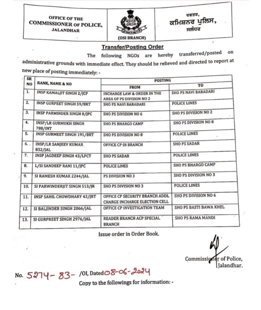 Reading: जालंधर कमिश्नरेट पुलिस में बड़ा फेरबदल, पुलिस कमिश्नर ने 13 SHO किये ट्रांसफर