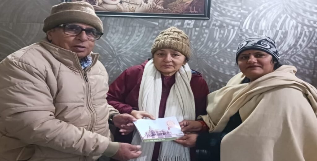 कपूरथला( गौरव मढ़िया ) 22 जनवरी 2024 का दिन सनातन धर्म को मानने वालों के लिए दिवाली जैसा होगा क्योंकि इस दिन भारत के उत्तर प्रदेश राज्य के अयोध्या शहर में भगवान राम की जन्मस्थली को समर्पित श्री राम मंदिर का उद्घाटन किया जा रहा है और इस दिन पूरी दुनिया में रहने वाले सनातनी लोग जहाँ दीपमाला करे और देश-विदेश के मंदिरों में दीप जलाने के साथ-साथ राम धुन और हनुमान चालीसा का पाठ भी करे।जिससे हम सभी इस पवित्र दिन पर उपस्थित हों सके।ये विचार भाजपा महिला मोर्चा की प्रदेश कार्यकारिणी की सदस्य रिंपी शर्मा ने 22 जनवरी को होने वाले श्री राम मंदिर प्राण प्रतिष्ठा कार्यक्रम का निमंत्रण पत्र वितरित करते हुए रामराज पाल और कैशा रानी को निमंत्रण पत्र देते हुए व्यक्त किए।