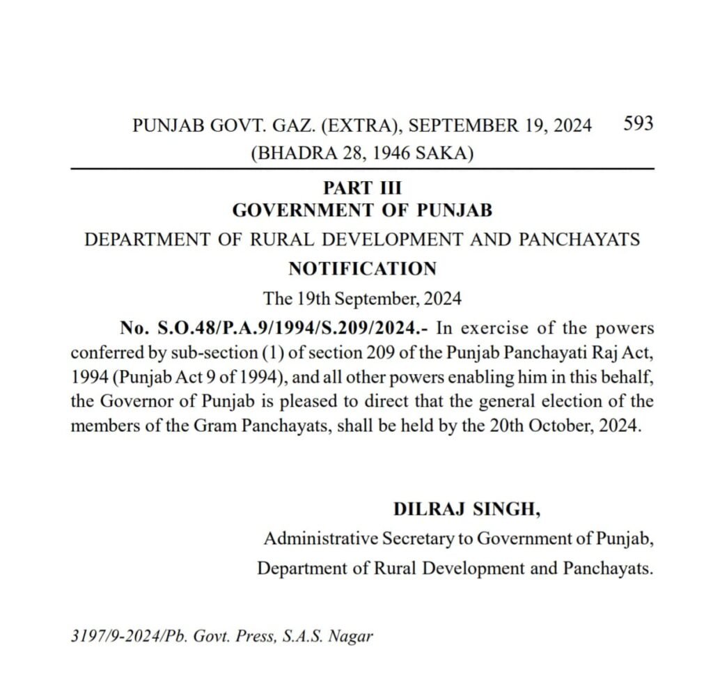 पंजाब में पंचायत चुनावों का ऐलान, 20 अक्टूबर तक होगा मतदान, पंजाब सरकार ने जारी किया नोटिफिकेशन पढ़ें