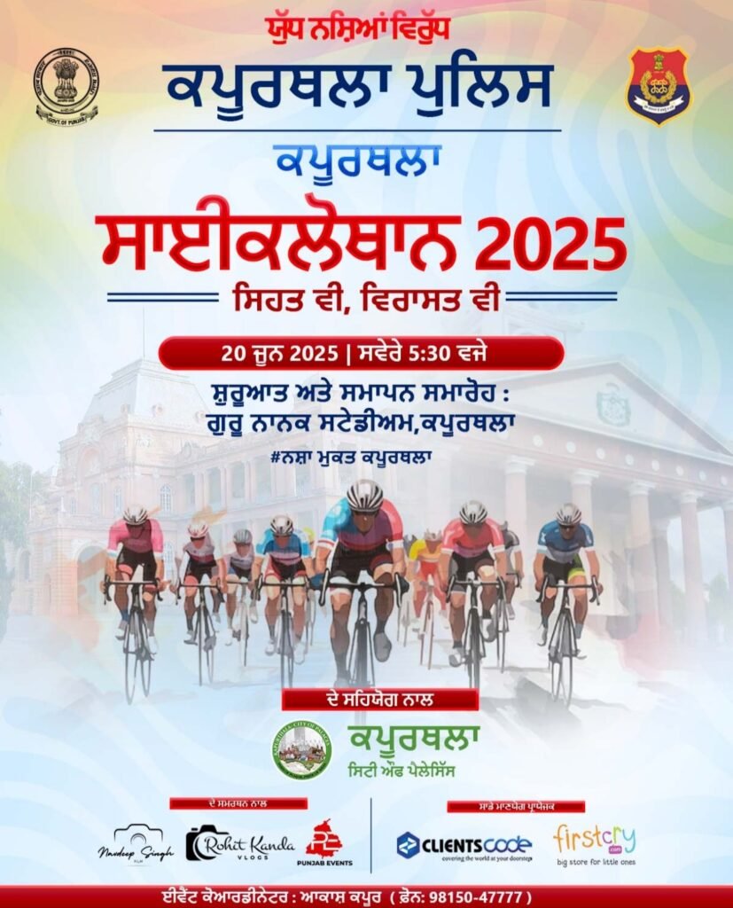 ਜਿਸ ਦਾ ਮਕਸਦ ਨੌਜਵਾਨਾਂ ਅਤੇ ਨਾਗਰਿਕਾਂ ਵਿੱਚ ਨਸ਼ੇ ਖਿਲਾਫ਼ ਜਾਗਰੂਕਤਾ ਫੈਲਾਉਣਾ ਹੈ। ਇਹ ਸਾਈਕਲੋਥਾਨ ਦੇ ਨਾਮ ਤੇ ਸਾਈਕਲ ਰੈਲੀ ਗੁਰੂ ਨਾਨਕ ਸਟੇਡੀਅਮ ਕਪੂਰਥਲਾ ਤੋਂ ਸ਼ੁਰੂ ਹੋਵੇਗੀ ਅਤੇ ਕਪੂਰਥਲਾ ਦੇ ਵਿਰਾਸਤੀ ਥਾਵਾਂ ਰਾਹੀਂ ਨਿਕਾਲੀ ਜਾਵੇਗੀ। ਇਸ ਰਾਹੀਂ ਲੋਕਾਂ ਨੂੰ ਸਿਹਤ, ਵਿਰਾਸਤ ਅਤੇ ਸਮਾਜਿਕ ਜਾਗਰੂਕਤਾ ਦੀ ਮਹੱਤਾ ਦੱਸਣ ਦੀ ਕੋਸ਼ਿਸ਼ ਕੀਤੀ ਜਾਵੇਗੀ ਇਸ ਸਾਈਕਲ ਰੈਲੀ ਚ ਹਰ ਆਮ ਅਤੇ ਖਾਸ ਨੂੰ ਸ਼ਾਮਿਲ ਹੋਣ ਦਾ ਸੱਦਾ ਹੈ ਹਰੇਕ ਨਾਗਰਿਕ ਆਪਣੇ ਸਮਾਜ ਨੂੰ ਨਸ਼ਾ ਮੁਕਤ ਕਰਨ ਚ ਆਪਣਾ ਵਡਮੁੱਲਾ ਯੋਗਦਾਨ ਦੇ ਸਕਦਾ ਹੈ