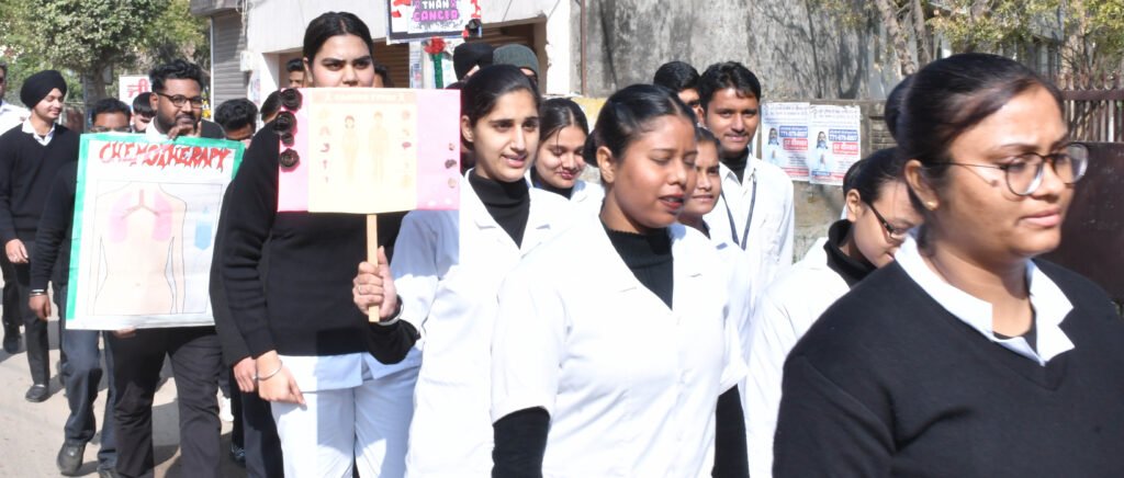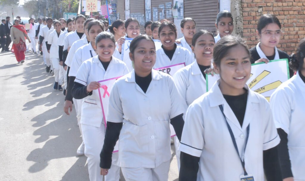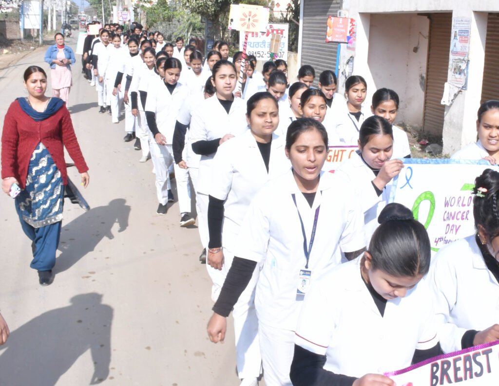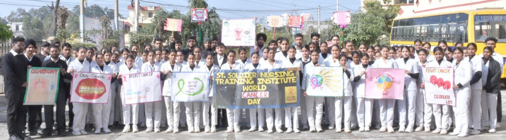 जालंधर, 3 फरवरी:- विश्व कैंसर दिवस पर सेंट सोल्जर नर्सिंग ट्रेनिंग इंस्टीट्यूट ने लोगों में कैंसर के बारे में जागरूकता पैदा करने के लिए खांबरा गांव में कॉलेज प्रिंसिपल नीरज सेठी और अन्य स्टाफ सदस्यों के नेतृत्व में नर्सिंग छात्रों द्वारा रैली का आयोजन किया गया । नर्सिंग छात्रों द्वारा पोस्टर\ और झंडे