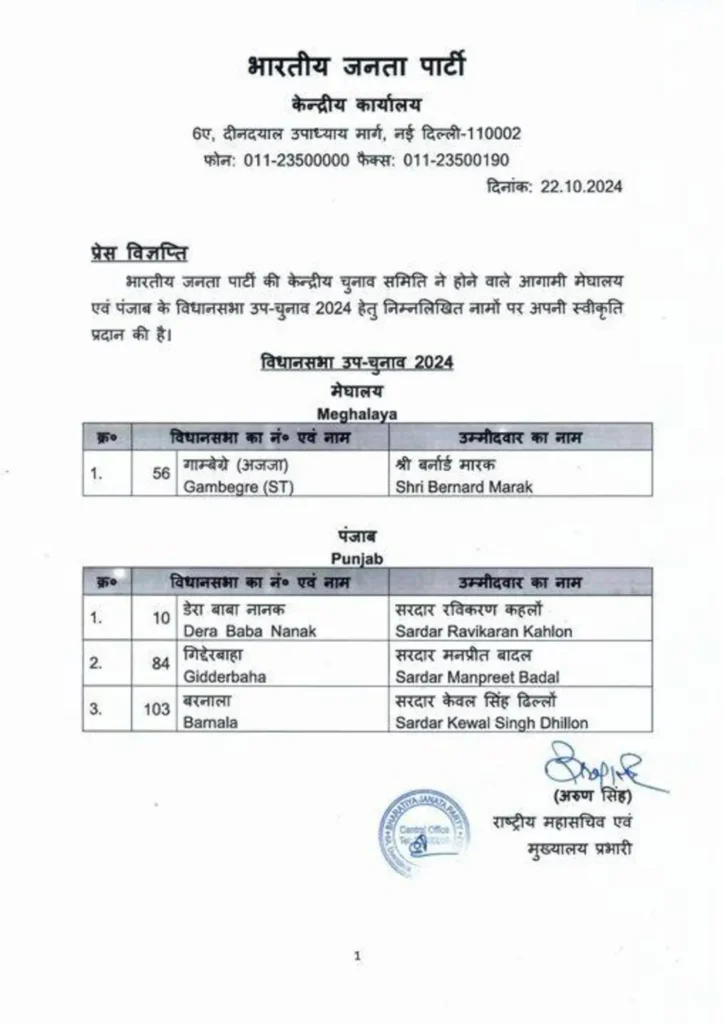 पंजाब विधानसभा उपचुनाव: BJP ने तीन सीटों पर घोषित किए उम्मीदवार, देखें लिस्ट