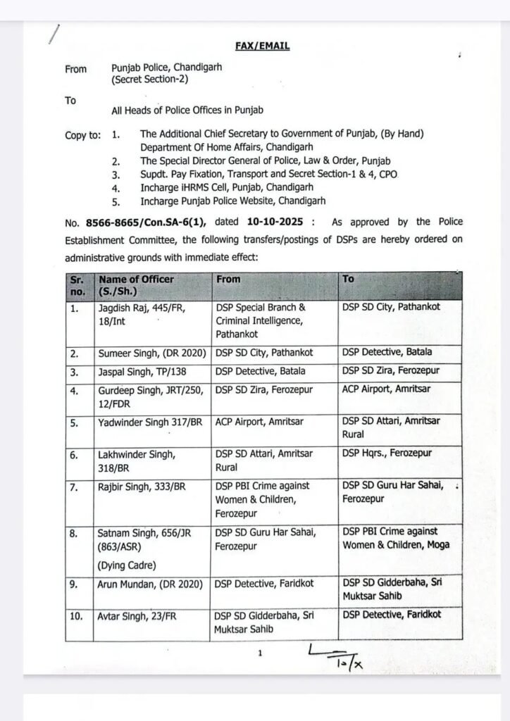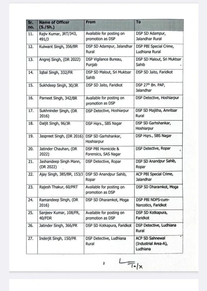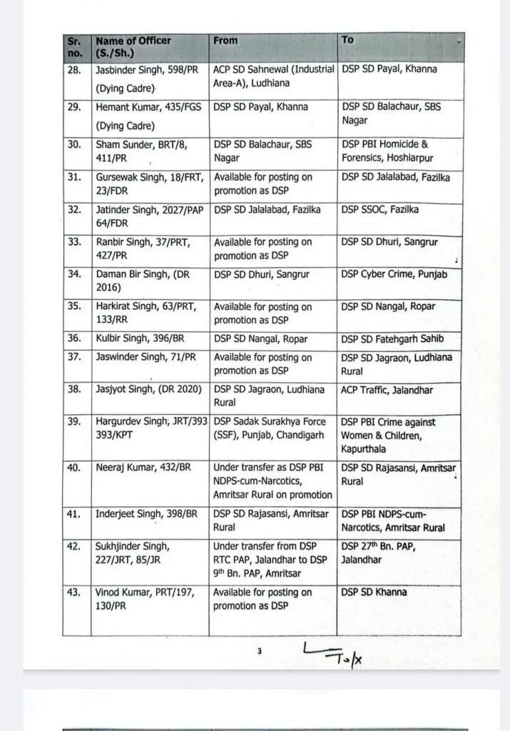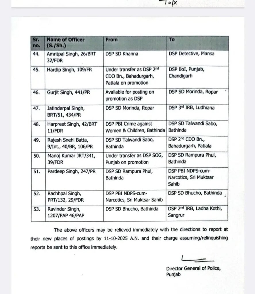 पंजाब में 53 DSP स्तर के अधिकारियों के पंजाब सरकार द्वारा ट्रांसफर किए गए हैं देखें उनकी लिस्ट